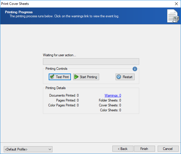 - On the Printing Progress page, select the Printing Controls to test, start, pause, or restart the printing process.