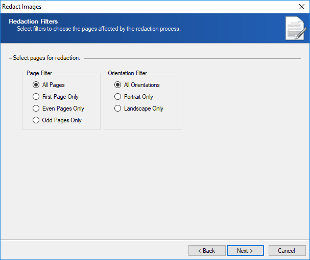- On the Redaction Setting page, select any Page Filter or Orientation Filter you want to apply.