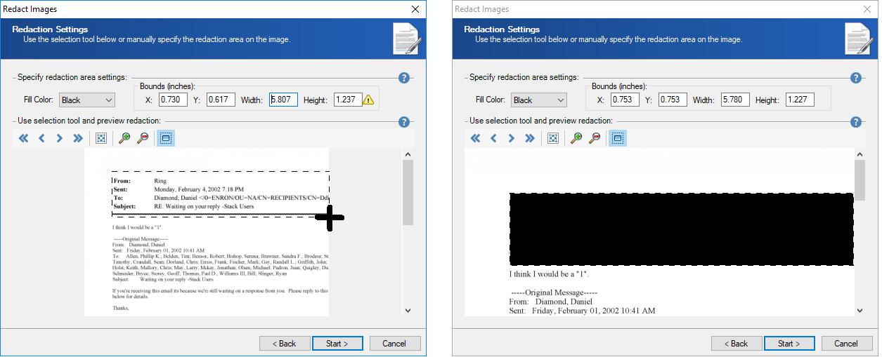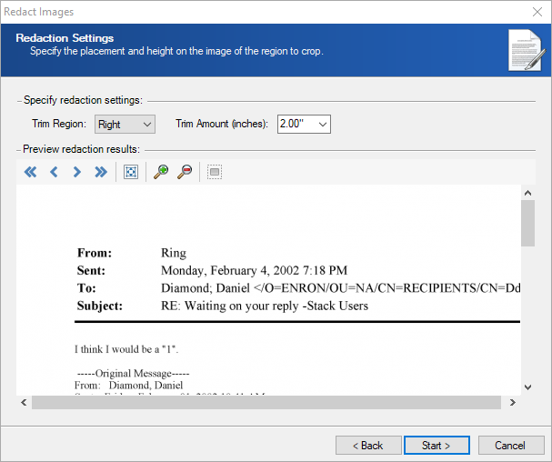 - On the Redaction Settings page, select the location and size of the area you want to trim from the image